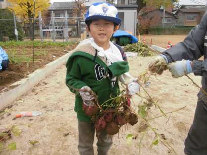 12月1日(火)今日は下京渉成小学校の第二施設の畑に,交流のお友達と一緒にお芋ほりに出かけました。地域の方が世話をしてくださって大きく育ったお芋は,大きくて子どもたちの顔ぐらいの大きさのものや,一つのつるにすずなりになっているものでいっぱいでした。どんどん出てくるお芋をほりだして大喜びの子どもたちでした。