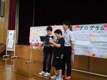 5月10日(火)支部の育成学級のみんなが参加する入学・進級おめでとう会に行ってきました。3組のみんなもこの行事に参加することをとても楽しみにしていました。6年生の2人は,おめでとう会で司会役になり,はっきりとした声でおめでとう会を進めることができました。学校紹介も,一人一人上手に紹介ができていました。他の学校のお友達とゲームをしたりダンスを踊ったり,楽しいひと時をすごしました。