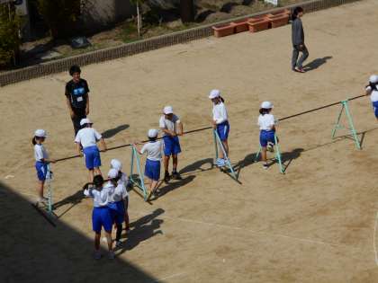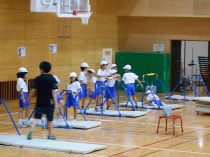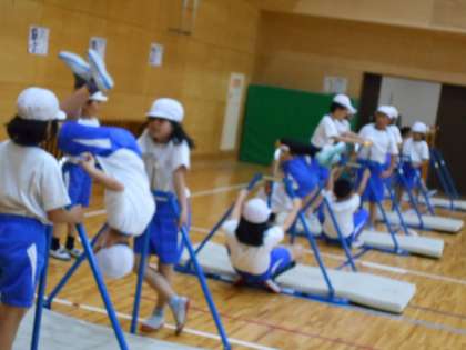 1本の棒を使ってどんな技ができるのか,頭や体を使ってチャレンジしています。今までできなかった技ができるようになったり,連続で回ることができたり,子どもたちの自信につながっています。できなくてもあきらめずに挑戦していく強い心も同時に身に付けてほしいと思っています。