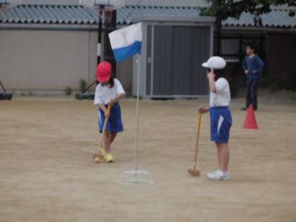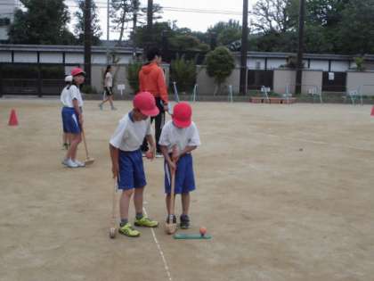 3年生は1年生の子どもたちに,「持ち方が違うよ,こうだよ。」「うまい!次はもっと力いっぱい打ってみてもいいかも!」としっかりと教えたり,励ましたりしていました。