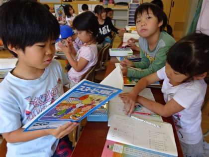 国語科の学習で,1年生で学んだ漢字を使って文を作りました。作った文を,嬉しそうに友だちに伝えることができました。