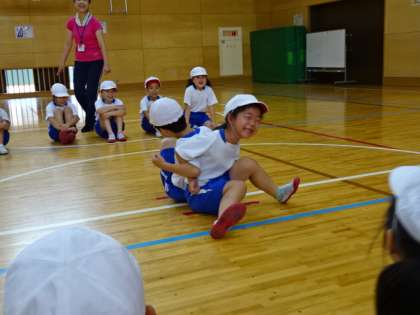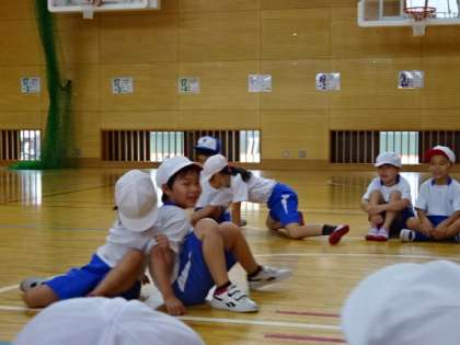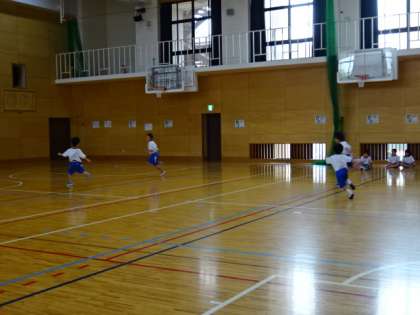 体育の学習では,体育館で「ようぐあそび・すもうあそび・おにあそび」の学習に取り組んでいます。