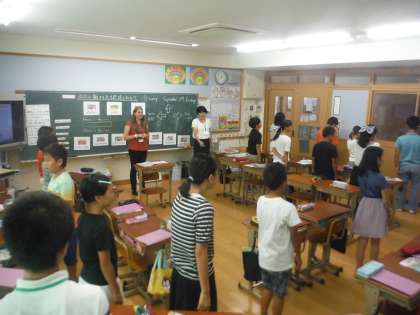 今回はALTのロファー先生にも来ていただき,右や左などの方向の伝え方を教えていただきました。ゲームなどを通して,子どもたちは楽しそうに表現に慣れ親しんでいました。