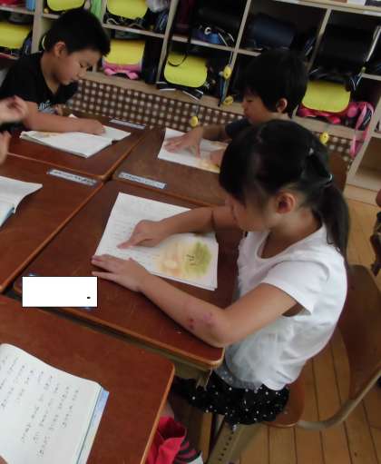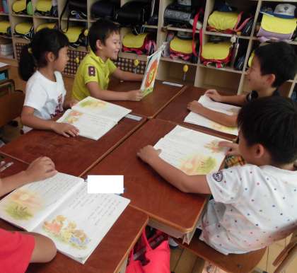 今までより少し長いお話ですが,班ごとに順番に読んだり,声を合わせて読んだりして音読を楽しんでいます。