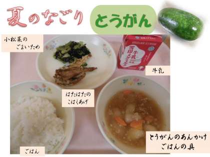 今日の給食は,夏の名残「とうがん」を使ったあんかけごはんです。