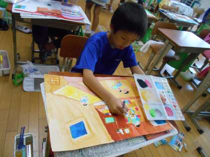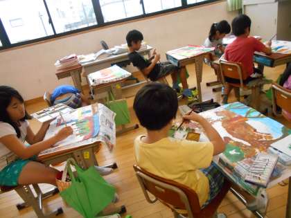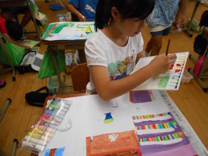図工の学習でお話の絵を描いています。先生の読み聞かせを聞いて想像した場面を紙に描いて行きます。ものの遠近感や色の濃淡,人間の関節などいろんな部分に注意して描きました。高学年になってきたので,少しずつ描き方を覚えて行ってほしいと思っています。