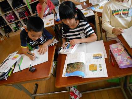 朝晩が寒くなり秋の訪れを感じる今日この頃…国語では秋を感じたものを詩や俳句に表してみました。肌で感じたこと,目で見たこと,心で感じたことを詩にのせていきました。もみじがきれいな様子を発表会と表現してみたり,いろんな顔を見せてくれるコスモスを取り上げたり,夏が過ぎるのがさみしい気持ちを表現したり,どの子も自分らしい表現をしていました。
