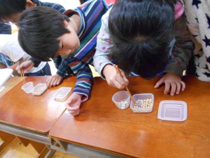 中間休みに3階ホールで豆つかみ大会が行われました。制限時間内にいくつ豆をお皿に移せるか…。箸の先端に全神経を集中させて取り組んでいました。