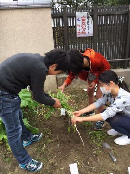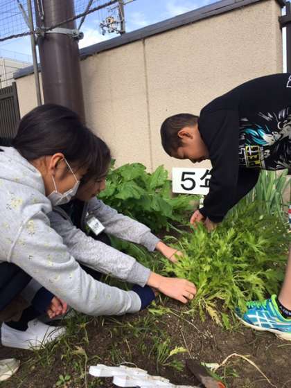 調理実習で使う京野菜「水菜」と「九条ネギ」を収穫しました。