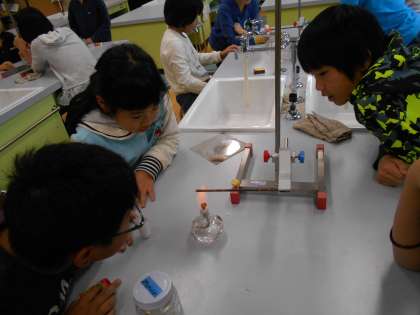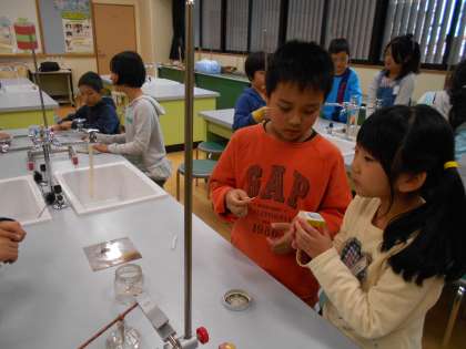もののあたたまり方という単元で金属をあたためてみました。色々な場所からあたため,どのようにあたたまって行くのかをろうそくを使って実験しました。実験してみると一目瞭然。百聞は一見にしかずというのはこういうことですね。実体験をしながら学べる授業はとても面白いです。火のつけ方もだんだん手慣れてきました。