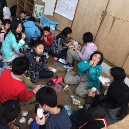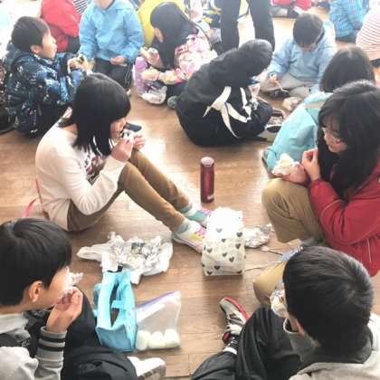 午後からの活動に向けて,まずは腹ごしらえ。午後からは,雪中運動会です。