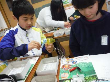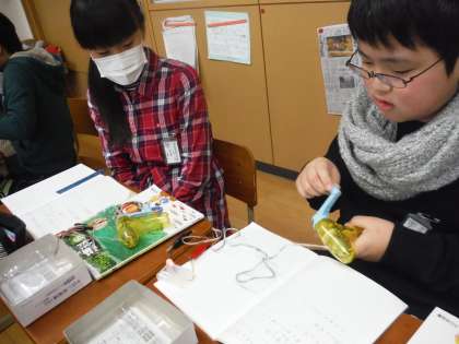 6年生の理科の学習の様子です。「手回し発電機」を使って,電気をつくりました。