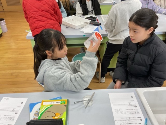 水を振ってどこまでとけるかな?「これってとけた?」「やっぱりとけ残るなぁ」と交流しながら学習していました。