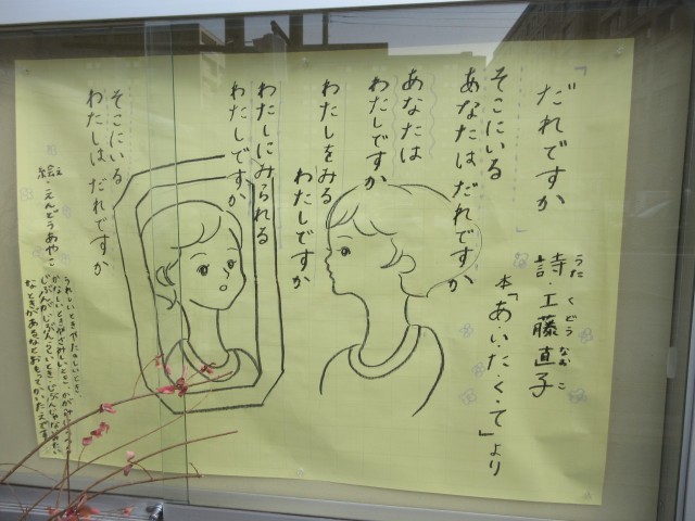 今月の渉成レジデンスの掲示は、工藤直子さんの詩集『あいたくて』より「だれですか」の詩です。