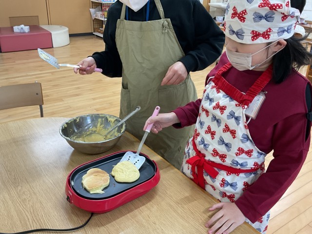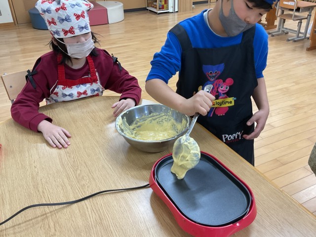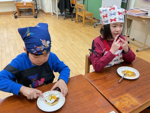 今年度も残りわずかになりました。1年間がんばったのでみんなでお楽しみ会でクッキングをしました。パンケーキを焼き、フルーツや生クリームをのせて食べました。自分たちで作ると特別においしかったですね!