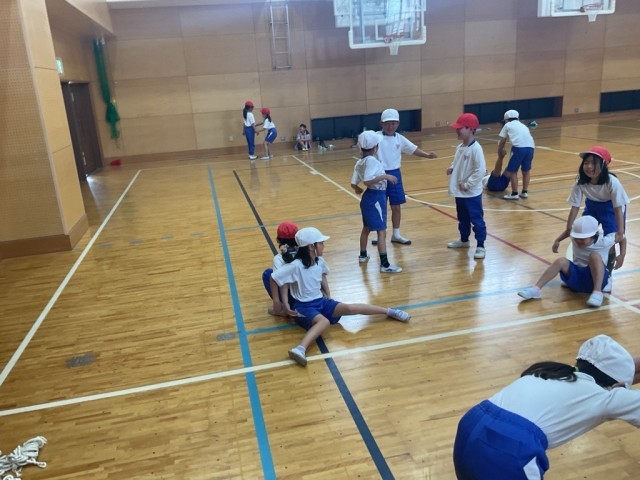 2人組で行うストレッチでは体を伸ばしていきます。「気持ちいい~。」と声が漏れてしまう子どもの姿も。