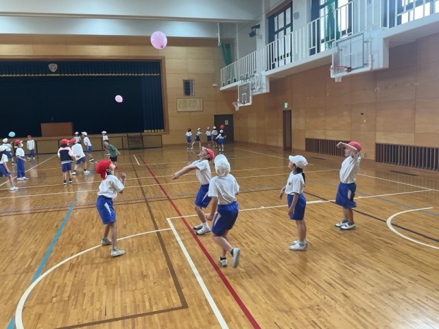 その後グループに分かれて風船バレーボールをしました。何回続けられるかな?協力しながら自然と声を掛け合って活動することができていました。