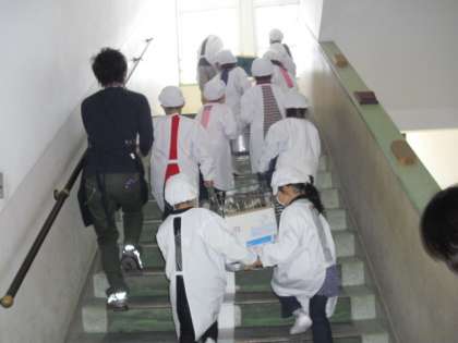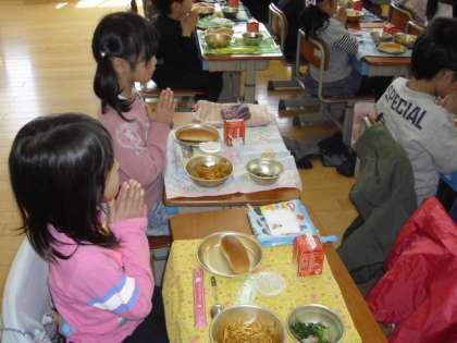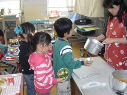 給食当番も,自分たちでできます。今日のメニューは,スパゲティのミートソース煮とほうれんそうのソティでした。みんな,おいしくいただきました。おかわりをするおともだちもいました。