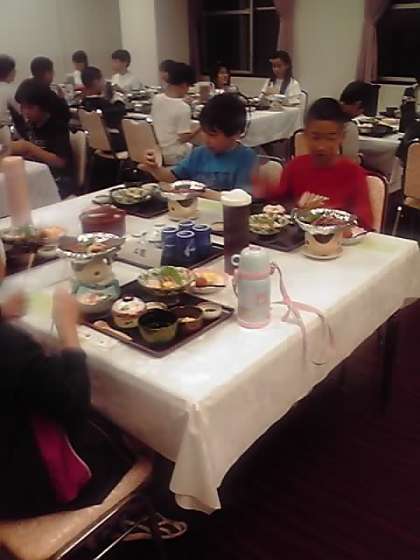 これから「ホテルいんのしま」で夕食です。「交流会で楽しかったこと」など話しながらいただきました。子ども太鼓交流会は尾道市教育委員会の主催で,今年は七団体の参加がありました。