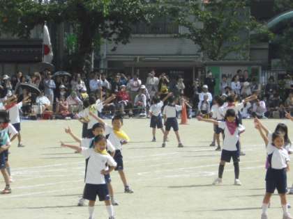1・2年生の団体演技は「のりのりダンス」です。みんなで〜ザ・ナイセスト・キッズ・イン・タウン〜「のりのり」になっておどります。「きめのポーズ」は,自分たちで考えました。