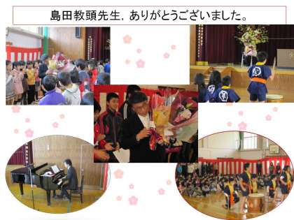 お世話になった島田教頭先生が,離任されました。時には厳しく,時には優しく子どもたちにご指導いただきました。最後に,醒泉校伝統の和太鼓の演奏を聞いていただきました。宇家教諭のピアノ演奏で見送りました。島田教頭先生,ありがとうございました。