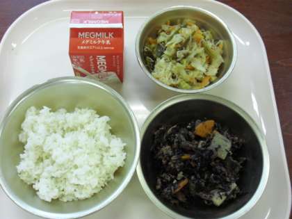 今日の献立は,「麦ごはん・牛乳・牛肉とひじきの炒め煮・ごまず煮」でした。