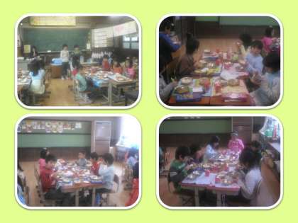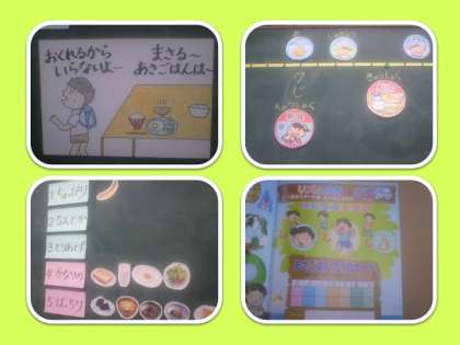 朝ごはんの学習をしました。今日の給食は,「麦ごはん・牛乳・さばのみそ煮・おから・はくさいの吉野汁」でした。「この前きいた,おばんざいの話にでてきたおからだあ。」とおぼえてくれている子がいて,うれしかったです!!
