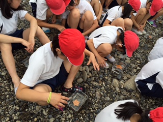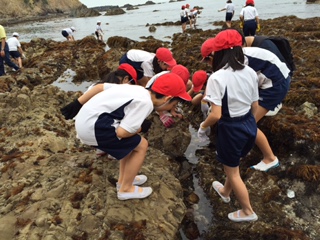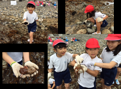 磯で生き物を探すときには,最初は恐る恐るでしたが,だんだん楽しくなりました。ヤドカリやカニ,ウニやタコを見つけました。タコを見つけたときには,大はしゃぎです。