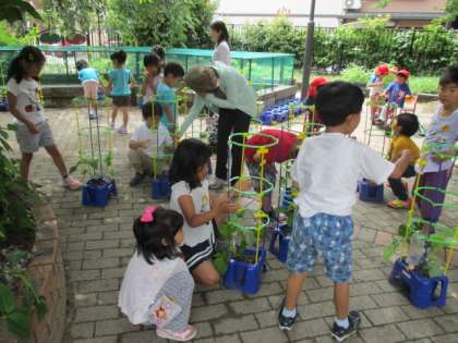 朝顔のツルがのびてきたので,支柱を立てました。