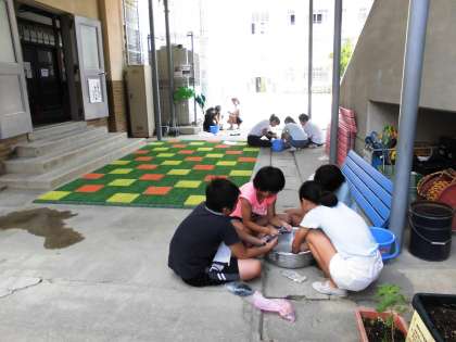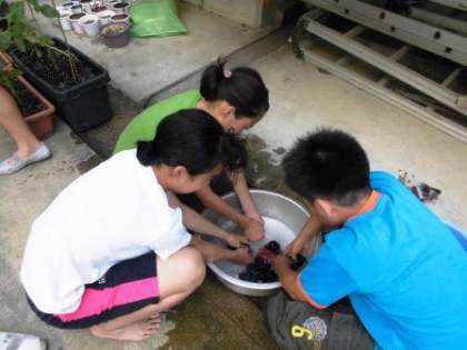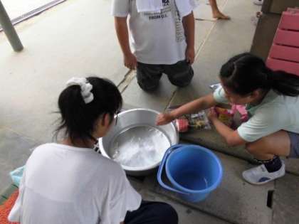 家庭科の学習で靴下の洗濯をしました。洗剤の用量をしっかり守って水に溶かして,洗濯を始めました。つまみ洗いで丁寧に靴下の汚れを落としました。たっぷりのため水ですすぎ,形を整えて干しました。