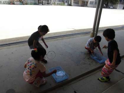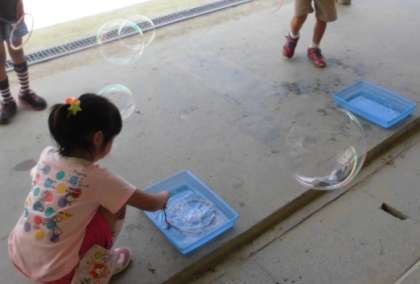 始めはちょっと緊張していた子どもたちですが,遊ぶうちにどんどんうちとけて,大喜びでシャボン玉をしていました。