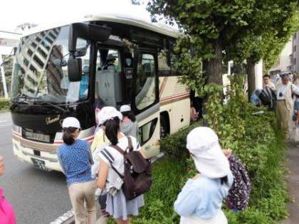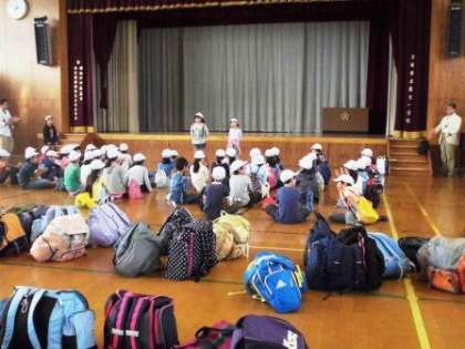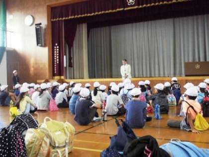 予定通り4年生が「みさきの家」に出発しました。出発式では,「けががなく安全に」「気持ちよく」過ごすというめあてを,全員で確認しました。