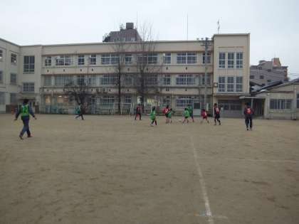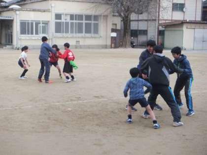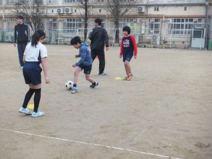 中学生が普段の練習で行っている基礎練習やパス練習を体験したり,1対1の対戦形式の練習をしたりして一緒に楽しみました。中学生のお兄さんたちに優しく教えてもらって,子どもたちは,とても楽しんで活動をしていました。