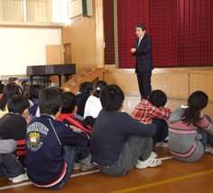 校長先生より,あの日の出来事を話していただきました。京都市内でも大きな揺れを経験し,本校校舎の大きな煙突(以前校舎内の暖房に使用)にも亀裂が入りました。(その後すぐに煙突は撤去されました)