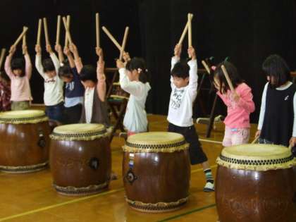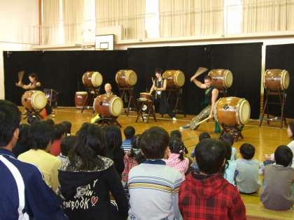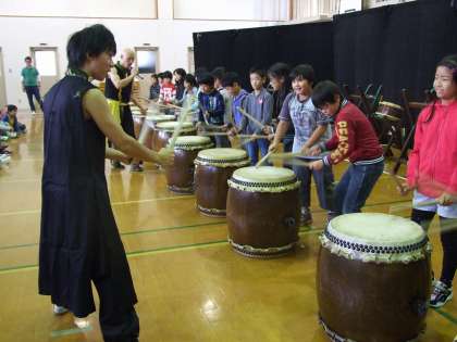 和太鼓演奏ユニットの相伝楼漫(そうでんろまん)に「和太鼓演奏と和太鼓ワークショップ」を実施していただきました。力強く勇壮な和太鼓の演奏に思わず体でリズムをとる姿も見られました。後半は,学年ごとに和太鼓をたたく体験をさせてもらいました。初めて和太鼓にさわる子も経験のある子もみんな一生懸命で,楽しく和太鼓をたたいていました。