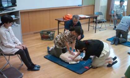 異物除去法や心肺蘇生法,AEDの使い方などの実技講習を行いました。