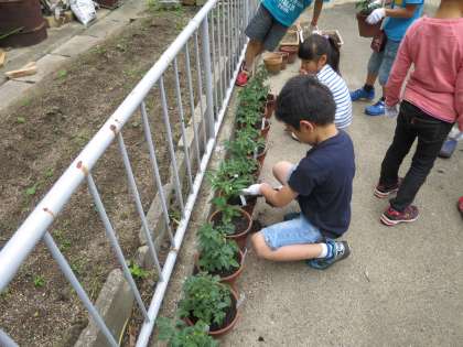 中間休みに低学年の児童が集まり,教頭先生の説明を聞いてから,トマトやししとうの苗を丁寧に植えました。