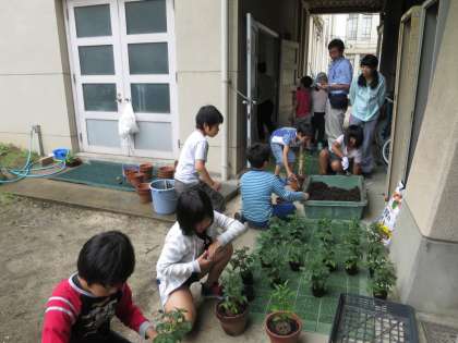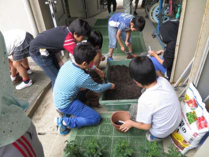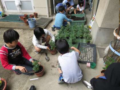 小雨の中ですが,自分の植木鉢に大切そうに苗を植えていました。実をつけてくれるのが楽しみですね!