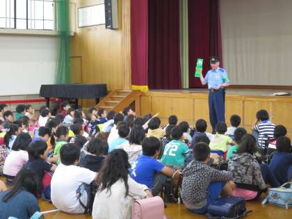 刑事さんが扮する不審者に教職員が対応している間に,児童たちは担任の先生の指示通り静かに体育館に避難しました。下京警察署員さんに,避難の様子をほめていただき,『いかのおすし』のお話を聞きました。
