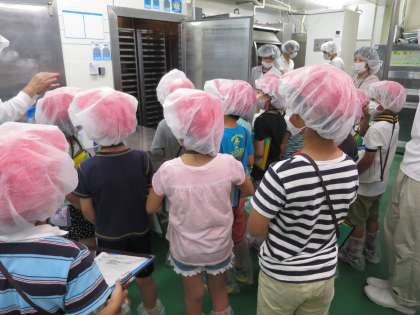 パンを作る工程から説明していただきました。パンは1日に1万3000個ほど作るそうです。10種類の機械を使います。パンはご飯より複雑で時間もかかります。