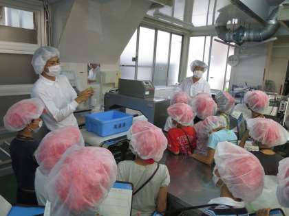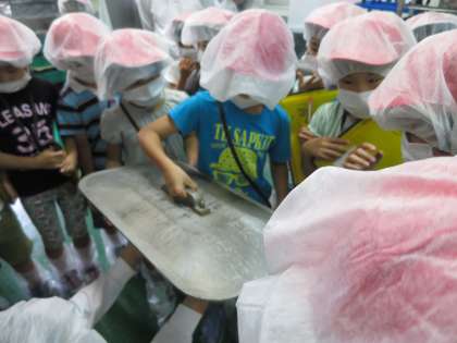 次にご飯の作り方の工程を説明していただきました。重い釜や蓋を実際に持たせてもらたり,金属探知機の精密さを試してもらったり,とてもわかりやすく見学できました。