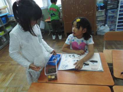 何を食べるのかな?住み心地がいいのはどんなところかな?いつも友だちと一緒に考えたり,相談し合ったりしてなぞや不思議を解決しようとしています。更には,図書室に行って図鑑や絵本を借りてきて,もっと知識を増やしています。すごいです。