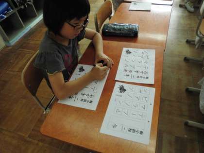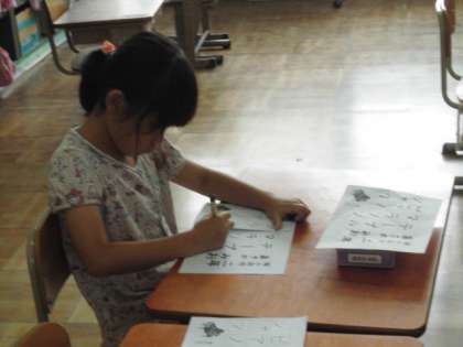 書写の学習で,硬筆書写作品展にむけて,これまで学習したカタカナのことばを視写しました。学年や名前ももう一度4つの部屋を確かめたり,止めやはらい・長さなど確認しました。