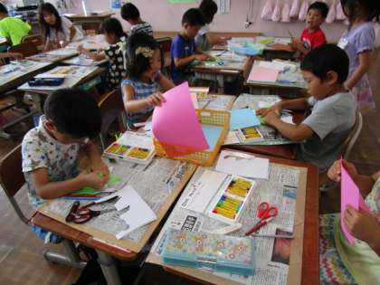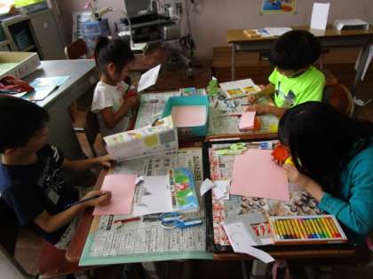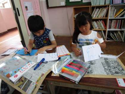 図工「おって たてたら」では紙を半分に折って立てられる仕組みを使って作品を作っています。教科書にも載っていたぞうを作ってみたり,縦長の形を生かしてロケットを作ったり,形を整えてかえるを作ったりしました。