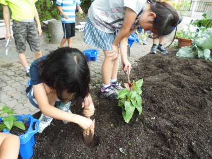 春に理科で3種類ずつの種をまきました。個人の植木鉢ではそろそろ窮屈になってきたので,1種類を残して後は畑に植え替えました。