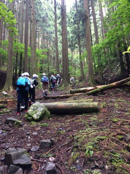 急斜面でしんどいですが、声を掛け合って登ります。
