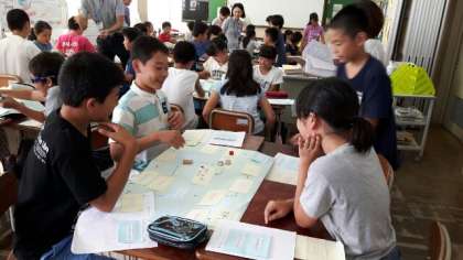 3枚目の写真は,6年生が自分たちでつくった「すごろく」を使って英語の学習をしているところです。