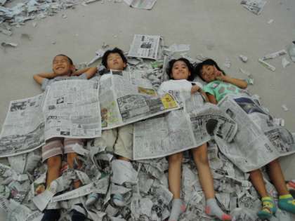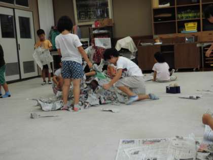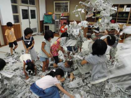 新聞紙を破いたり,丸めたりして学習しました。布団をつくったり,紙ふぶきを作って楽しみました。