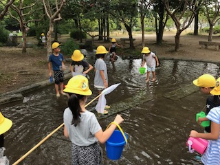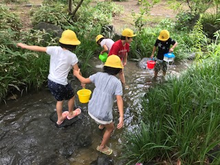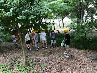 学校にはない大きな森と,水辺でどんな生き物が見つかるかな?子どもたちは,手作りのマイ虫かごを肩にかけ,意気揚々と探しに行きました。