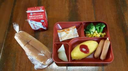 朝ごはんは、パンとプレーンオムレツとウインナー・・・